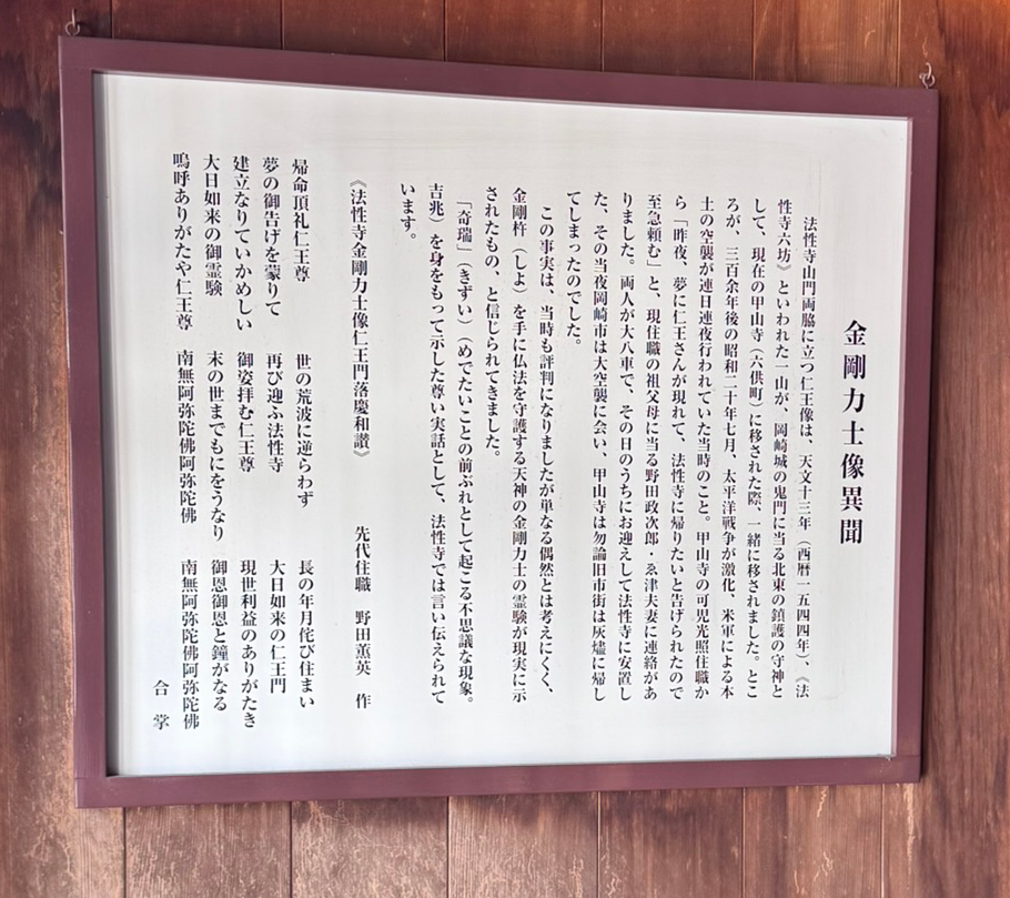 ところが、それから三百余年の後、昭和二十年七月、太平洋戦争が激化。米軍による本土空襲が連日連夜行われていた当時のこと。甲山寺の可児光照住職から「昨夜、夢に仁王さんが現れて”法性寺に帰りたい”と告げられたので支給頼む」と、当時の法性寺住職 野田政次郎・ゑ津夫妻に連絡がありました。両人が大八車で、仁王像をその日のうちにお迎えして法性寺に安置したその当夜、岡崎市は大空襲に会い、甲山寺はもちろん旧市街は灰燼に帰してしまったのでした。
