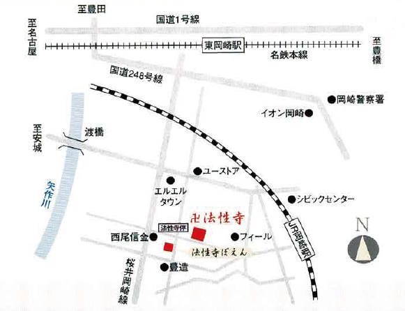 JR岡崎駅西口初(中野郷経由)/名鉄東岡崎駅行き(約5分)「法性寺」停下車